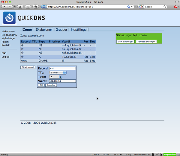 Klik på "Gem ændringer" for at gemme dine records på zonen.